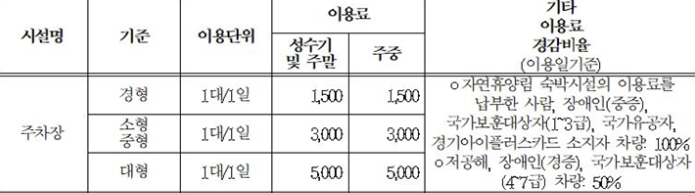 - 휴양관 및 숲속의 집 지정 인원에 따라 1~2대까지 무료로 주차 가능합니다 .