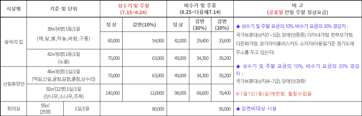 숲속의집, 산림휴양관, 회의실의 이용금액은 아래와 같습니다.