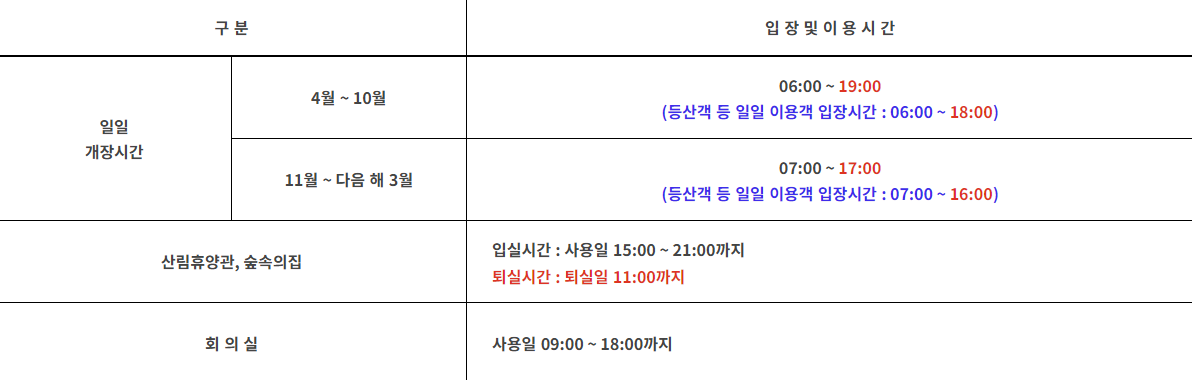 강씨봉 자연휴양림은 3월부터 11월까지 운영되며, 운영 시간은 오전 6시부터 오후 7시까지입니다 .