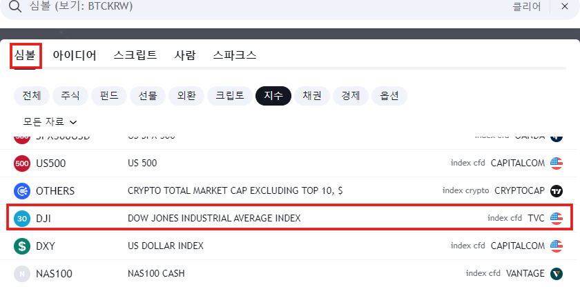 - 검색 방법: 상단 검색 탭에 "NASDAQ" 또는 "Dow Jones"를 입력합니다.