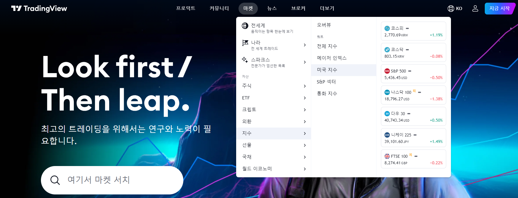 - 지수 확인: "시장" 메뉴에서 "지수"를 선택한 후 "세계 주요 지수"를 클릭합니다.