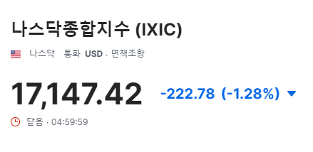 전일 대비 지수의 변화를 포인트와 퍼센트로 나타냅니다. 현재 나스닥 지수는 전일 대비 222.79포인트(-1.28%) 하락한 상태입니다.